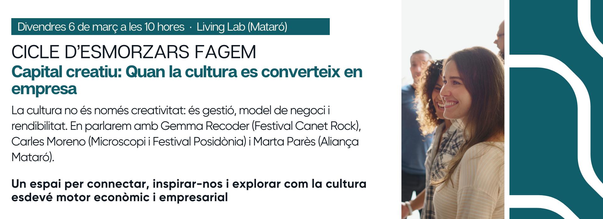 Llegir mésLa cultura també pot esdevenir empresa rendible i generadora d’impacte econòmic. En la segona sessió del Cicle d’Esmorzars FAGEM posarem el focus en el capital creatiu i en com els projectes culturals es consoliden com a iniciatives empresarials sòlides. Divendres 6 de març conversarem amb Gemma Recoder (Festival Canet Rock), Carles Moreno (Microscopi i Festival Posidònia) i Marta Parès (Aliança Mataró).