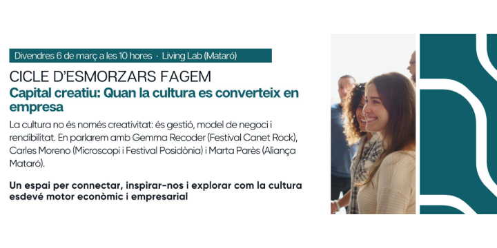 Afegir al calendari 2026-03-0610:00 2026-03-0612:00 Europe/Madrid Cicle d’Esmorzars FAGEM: Capital creatiu: Quan la cultura es converteix en empresa Living Lab (Mataró)