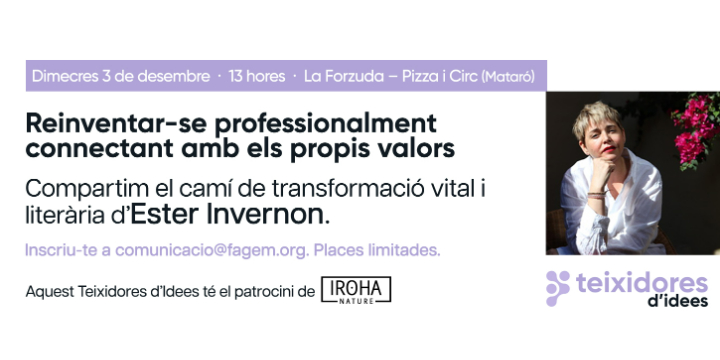El Teixidores d’Idees amb Ester Invernon tindrà lloc el dimecres 3 de desembre a les 13 h a La Forzuda – Pizza i Circ (c. de Sant Pere, 31, Mataró). L’acte, que compta amb el patrocini de Iroha Nature by Sensalia Labs, tancarà el cicle Teixidores d’Idees d’aquest 2025, una iniciativa que reuneix dones amb responsabilitat empresarial per crear espais de complicitat, inspiració i aprenentatge compartit.